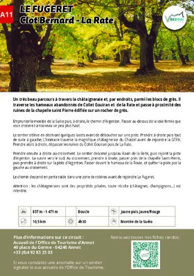 Take the Suéio rise, then right onto the Chemin d’Argenton. Pass over the railroad line, which you will cross again a little further up. The path twists and turns upwards before coming out onto a track. Turn right, then immediately left; the route crosses the magnificent Chastel chestnut grove before rejoining the GTPA. Turn right, passing the ruins of Collet Gouiran and La Rate. Turn right at the crossroads. The path descends to Ravin de la Beïte, then joins the Argenton track. Follow it southwards. At the crossroads, turn right, passing the Chapelle Saint-Pierre, then right onto the Argenton track. Pass the hamlet of La Rouie, and leave the track on the left at the crossroads. The path descends steeply through an area of chestnut groves before reaching Le Fugeret.
