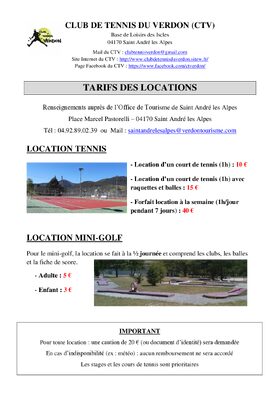 Court rental: 10€ / hour Court rental with rackets and balls: 15€ / hour Weekly rental package (1 hour/day for 7 days): €40