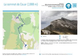 A partir de la citerne suivre la piste et après la première épingle prendre le sentier balisé jaune direction le carton. Avoir croisé un petit ru le sentier se met à sinuer, (gauche, droite, gauche, droite, et une dernière fois à gauche pour reprendre la piste. Il faut la suivre jusqu’au pas d’Archail avec en vue sur la droite le majestueux et élégant Cheval Blanc. Un peu avant d’arriver aux Cabanes du Pas d’Archail, prendre le sentier balisé jaune sur la gauche, direction le Couar. Pour arriver au sommet les balises sont marquées, le sentier bien tracé, la pente est régulière. Après 1,5 km d’ascension la vue s’offre sans réserve à 360 °…