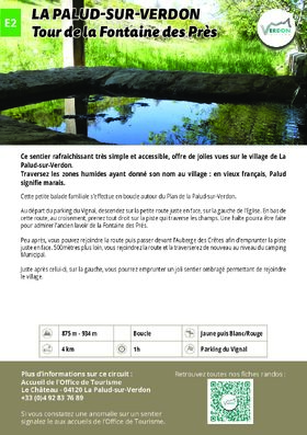 This short family walk takes you on a loop around the Plan de la Palud-sur-Verdon. From the Vignal parking lot, take the small road opposite, to the left of the church. At the bottom of this road, at the crossroads, go straight ahead on the track that crosses the fields. Stop to admire the old Fontaine des Prés wash-house. Shortly afterwards, you can rejoin the road and pass the Auberge des Crêtes to take the track opposite. 500m further on, you rejoin the road and cross it again at the municipal campsite.