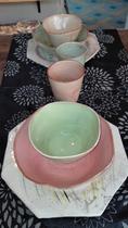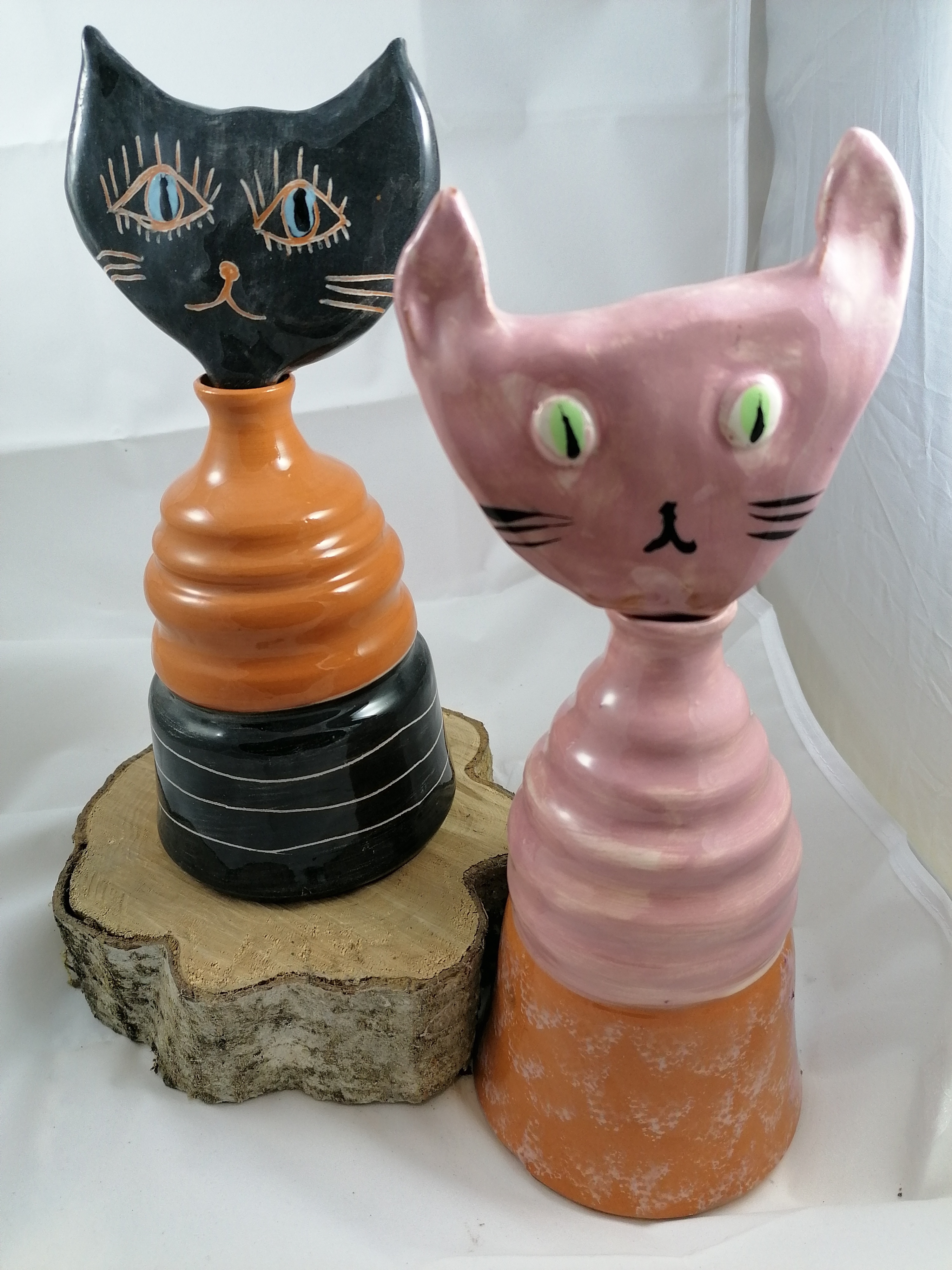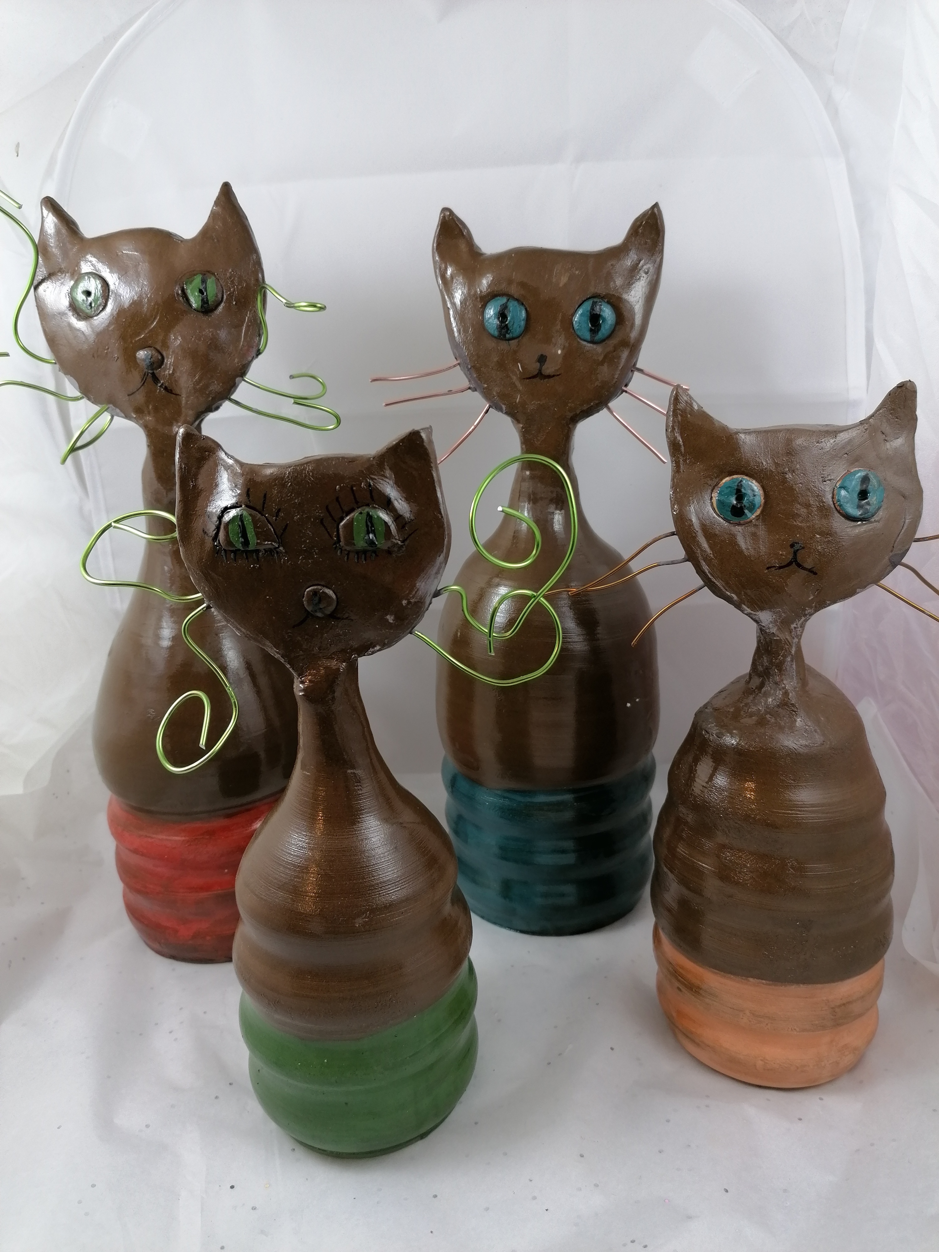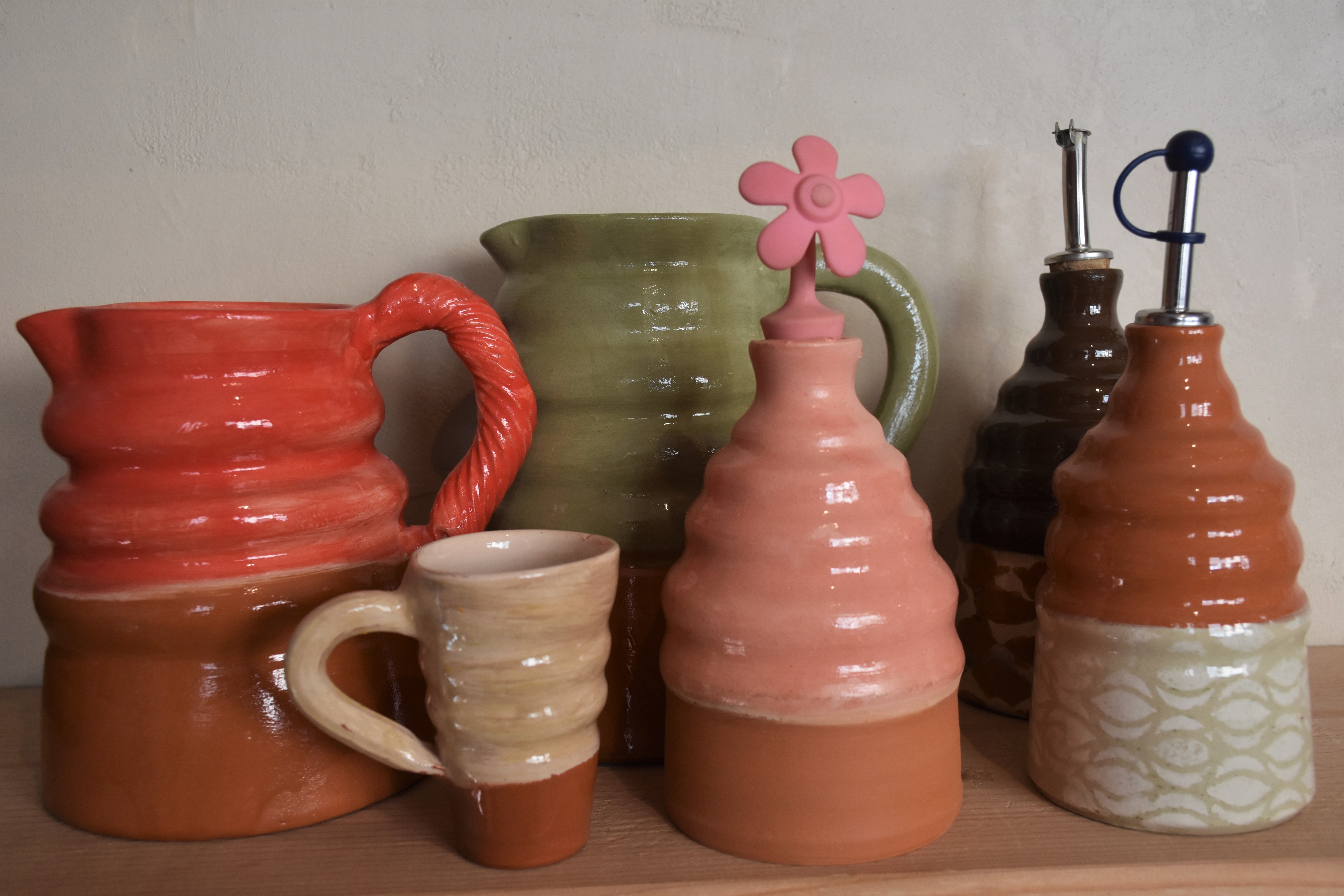 Dans son atelier, elle crée une grande variété de céramiques, utilitaires ou non, toujours empreintes de sensibilité artistique : bols, tasses, mugs, pichets, plats à gratin, ainsi que des sculptures animalières (chats, chiens, moutons…). Couleurs et formes originales traversent l’ensemble de ses collections.