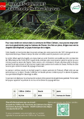Le départ de la randonnée se fait depuis la piste qui traverse le hameau de Chasse. La suivre et traverser le hameau de Chasse. En profiter pour visiter la Chapelle Saint Raphaël. Continuer sur la sente longeant le vallon de Chasse jusqu’à la première intersection où il faudra tourner à gauche. Poursuivre la montée jusqu’à la seconde intersection, où il faudra de nouveau prendre un sentier sur la gauche, en direction de la Cabane de Chabaud. Le sentier de droite est l’itinéraire par lequel nous allons revenir au terme de notre boucle.