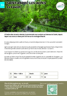 A l'ombre des versants reboisés, la promenade vous conduira au hameau du Coulet, depuis lequel vous aurez un beau point de vue sur la montagne Maurel.