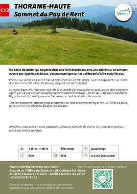Une fois que la montée a débuté dans la forêt, l’itinéraire est très simple : suivre l’unique sentier qui monte droit sur environ 500 mètres de dénivelé, jusqu’à arriver au Pic de Rent. Au départ, traverser la forêt, avant que celle-ci se fasse de plus en plus éparse, jusqu’à arriver dans une prairie alpine. Çà et là, des buissons de lavande viennent parfumer l’itinéraire. Une fois au Pic de Rent, le sommet du Puy de Rent est bien visible, à environ 650 mètres, au bout de la belle crête arrondie. Des cairns jalonnent l’itinéraire jusqu’au sommet. Vous voilà au sommet du Puy de Rent, à 1996 m d’altitude, point culminant du Massif des Préalpes de Castellane.