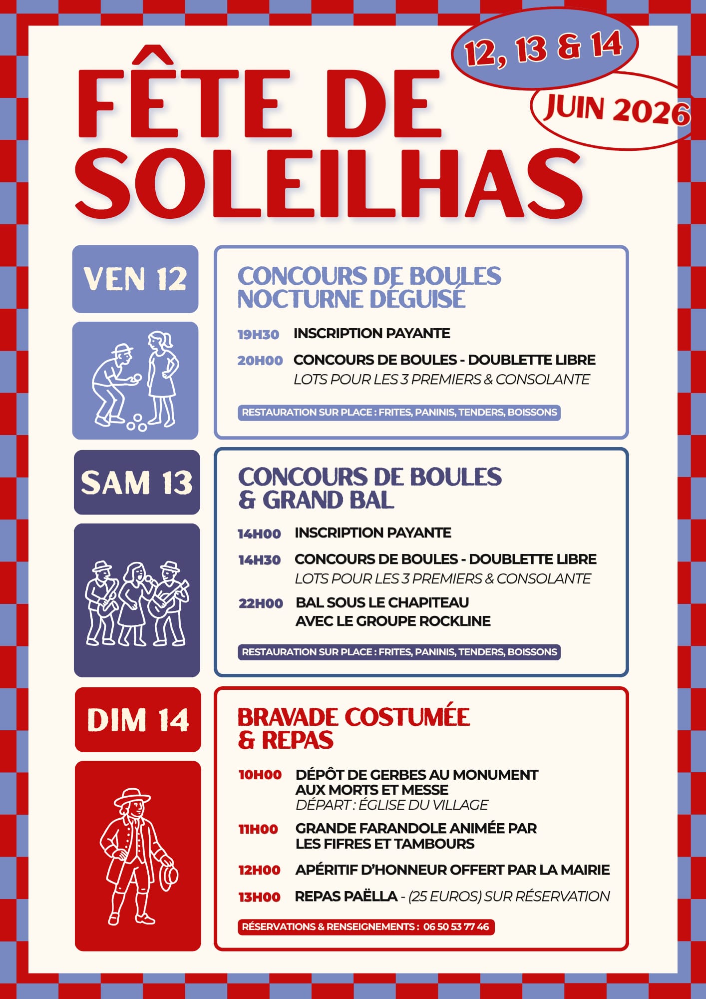 – 19h30 participez au concours de boules nocturne déguisé avec inscription payante et début du concours à 20h00.