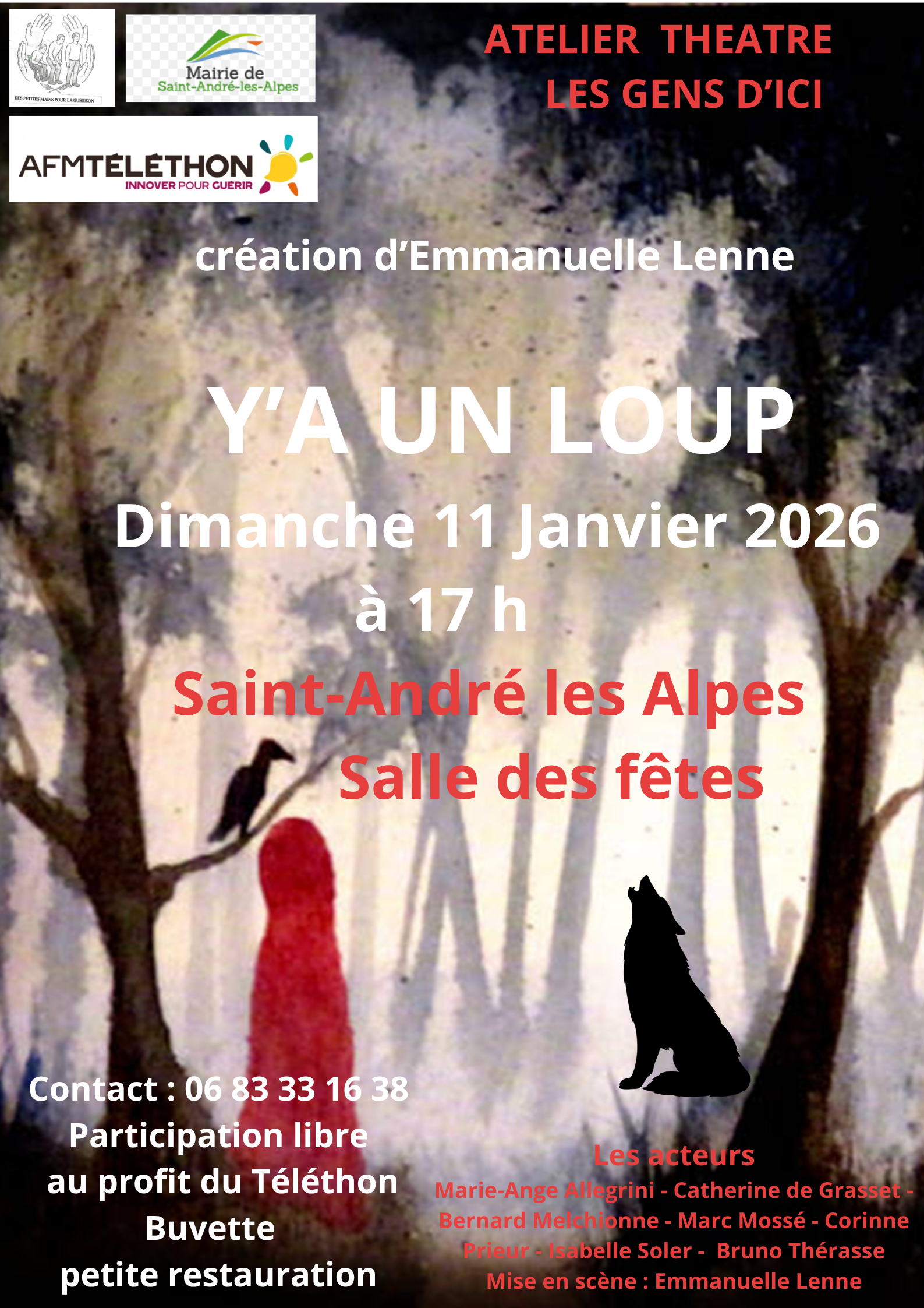 En collaboration avec l’association des Petites Mains pour La Guérison et la Mairie de Saint André Les Alpes, représentation théâtrale par Les Gens d’Ici de Clumanc au profit du Téléthon, avec buvette et petite restauration.