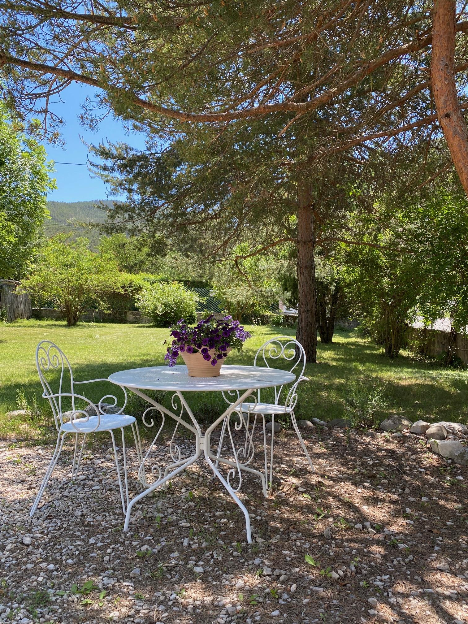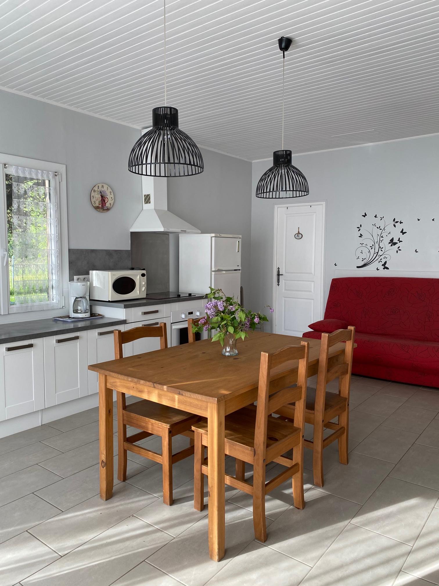 Séjour avec coin cuisine et espace détente avec 1 canapé convertible en 140 et 1 canapé en 90, 1 chambre avec 1 lit en 140, salle de bains avec douche / wc. Terrasse couverte et jardin privatifs.