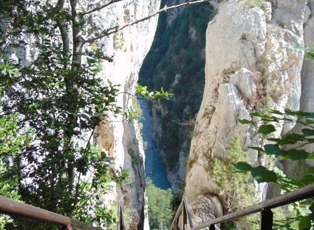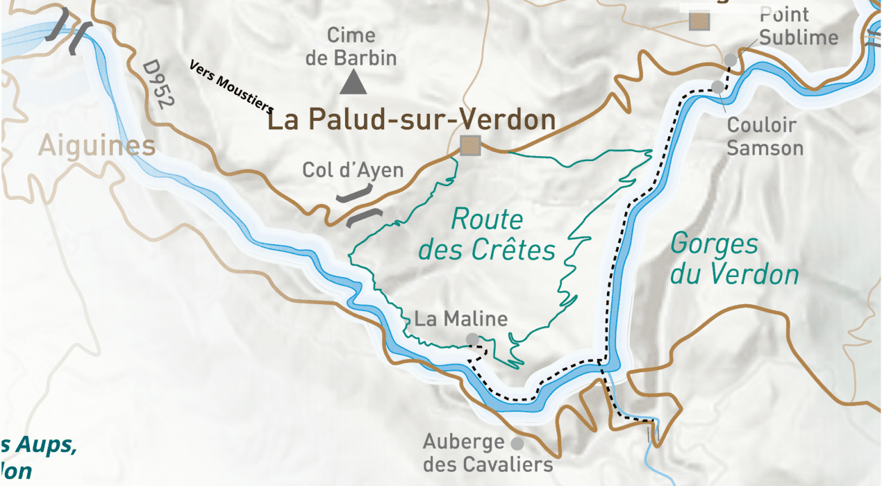 Il percorso porta in fondo al canyon, il più vicino possibile al Verdon, e permette di visitare alcuni dei luoghi leggendari del Verdon, come la Pré d’Issane, balsamo di bue, la Mescla, la violazione Imbert, i ghiaioni di Guègues, le gallerie di Trescaïre e Baou, il Corridoio di Samson…