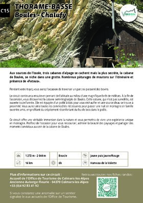 A la balise mentionnant Barre de Boules (1 990 m), gagner en aller/retour le col de Vachière (point de vue sur la vallée de la Haute-Bléone et le massif de l’Estrop). Revenir et poursuivre à flanc de montagne à travers les pâturages. Passer une zone rocheuse où se succèdent de nombreuses sources, rejoindre un petit col où se situe une première cabane et descendre sur l’autre versant. Traverser le vallon en contrebas, passer devant un petit oratoire et rejoindre la cabane pastorale de Chalufy. Suivre le sentier passant au pied celle-ci et poursuivre la descente à flanc de montagne. Le sentier traverse plusieurs vallons puis remonte à travers une zone de robine. En contrebas de la cabane pastorale des Abeurons, suivre le sentier montant sur la droite et rejoindre un croisement au milieu d’une prairie.