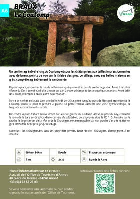 Descendre la piste d’abord en rive droite puis en rive gauche du Coulomp. Arrivé au pont du Gay, remonter le ravin de la Lare en direction d’une carrière d’exploitation, on emprunte alors la RD 110. Prendre sur la gauche le large sentier de la “Porte de la Chataigneraie”, remarquable par son porche d’entrée réalisé en grès. Remonter cette piste jusqu’au village.