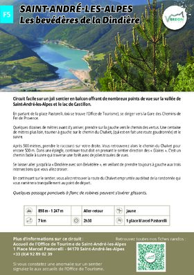 Da Place Pastorelli (dove si trova l’Ufficio del Turismo), dirigetevi verso la stazione dei Chemins de Fer de Provence. Poche decine di metri prima dell’arrivo, svoltare a sinistra sullo Chemin des Vertus. Un centinaio di metri dopo, svoltate a sinistra sullo Chemin du Chalvet (che in realtà è una strada asfaltata) e seguitelo. Dopo 500 metri, prendete la scorciatoia sulla destra. Questa vi riporterà sullo Chemin du Chalvet per altri 500 metri. Ad un tornante, proseguire dritti lungo il sentiero in direzione di “Les Glaires”. Si tratta di un sentiero facile che attraversa il bosco e offre una bella vista. Seguite il sentiero fino a “Dindière avec son Belvédère”, avendo cura di girare sempre a sinistra ai tre incroci che incontrate. Proseguendo lungo il sentiero, si ritrova la strada di Chalvet percorsa all’inizio dell’escursione, che riporta al punto di partenza.
