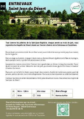 Poursuivre vers la forêt. Le chemin passe devant deux oratoires, franchit de nombreuses ravines avant de parvenir, après la dernière, à un chemin d’exploitation. Poursuivre en face et parvenir au col de Saint-Jeannet. Continuer tout droit, le sentier descend dans la forêt, passe devant une source. Vous arrivez à la chapelle de Saint-Jean du Désert. Le retour s’effectue par le même itinéraire.