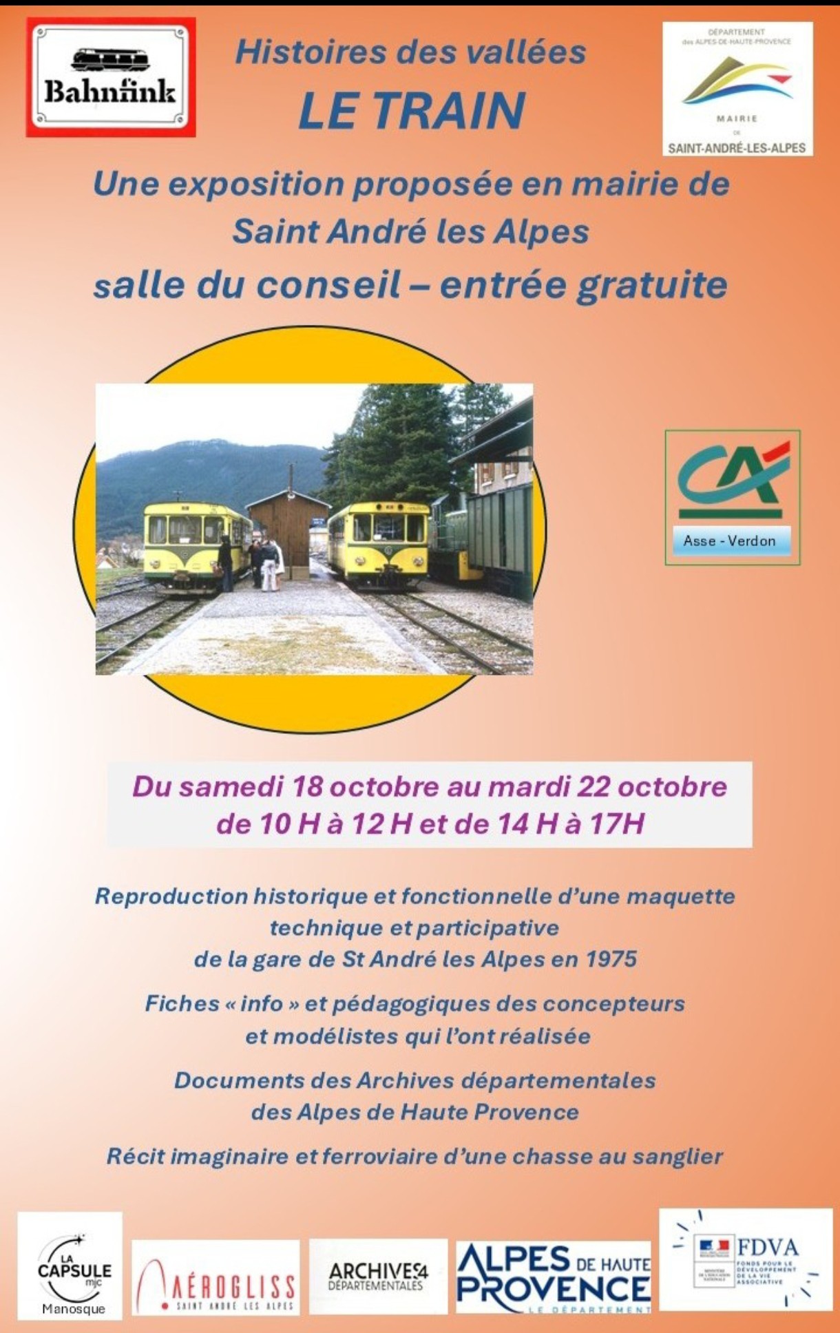 L’association Bahnfink propose une exposition dans le cadre de la manifestation “Trains Provence et Patrimoine”. Venez découvrir une maquette fonctionnelle de la gare de Saint-André-les-Alpes en 1975 et un grand nombre de fiches “info” et pédagogiques…