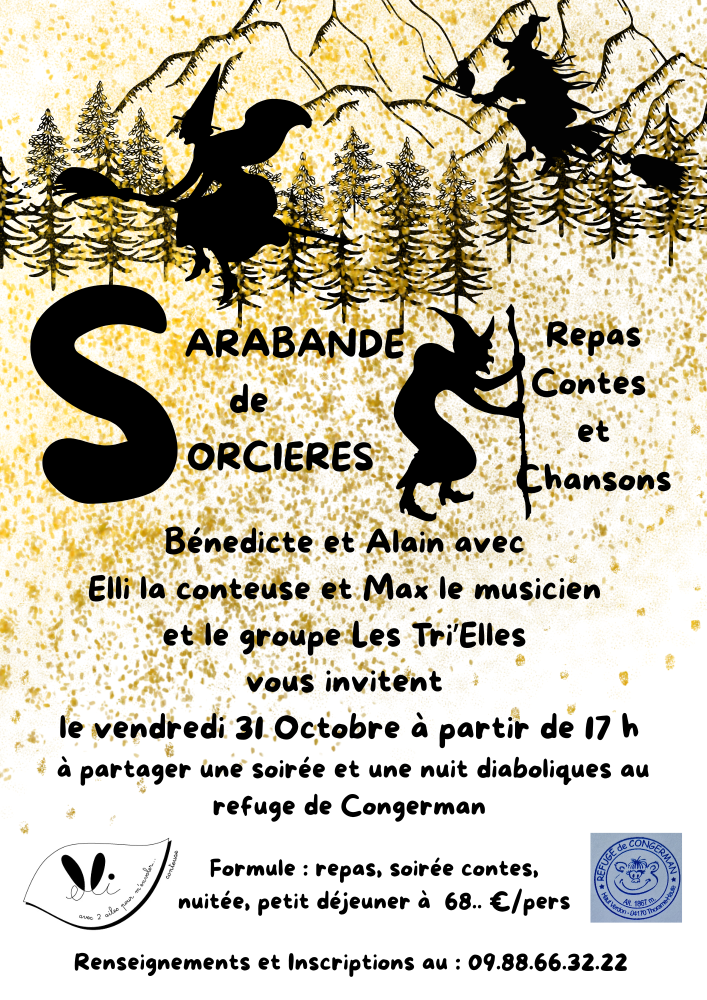 Bénédicte et Alain avec Elli la conteuse et Max le musicien et le groupe les Tri’elles vous invitent à partager une soirée et une nuit diabolique au refuge de Congerman. Accès possible par la piste de Ondres.