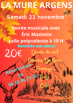 Soirée musicale avec Eric Maximin. Au menu : daube de cerf, pommes de terre, fromage, tarte et café. Buvette sur place.