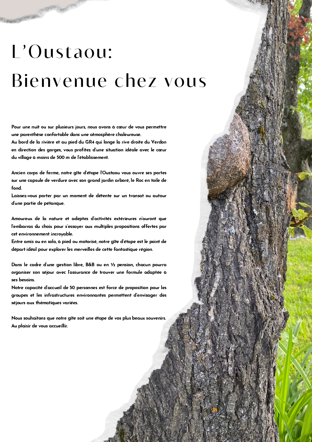 Ancien corps de ferme, notre gîte d’étape l’Oustaou vous ouvre ses portes sur une capsule de verdure avec son grand jardin arboré, le Roc en toile de fond. Laissez-vous porter par un moment de détente sur un transat ou autour d’une partie de pétanque. Amoureux de la nature et adeptes d’activités extérieures n’auront que l’embarras du choix pour s’essayer aux multiples propositions offertes par cet environnement incroyable. Entre amis ou en solo, à pied ou motorisé, notre gîte d’étape est le point de départ idéal pour explorer les merveilles de cette fantastique région. Possibilité de restauration sur réservation.