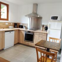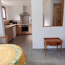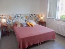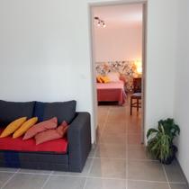Logement de 40M2, une chambre avec un lit en 160, un séjour avec un canapé et une cuisine équipée. Espace extérieur avec pergola