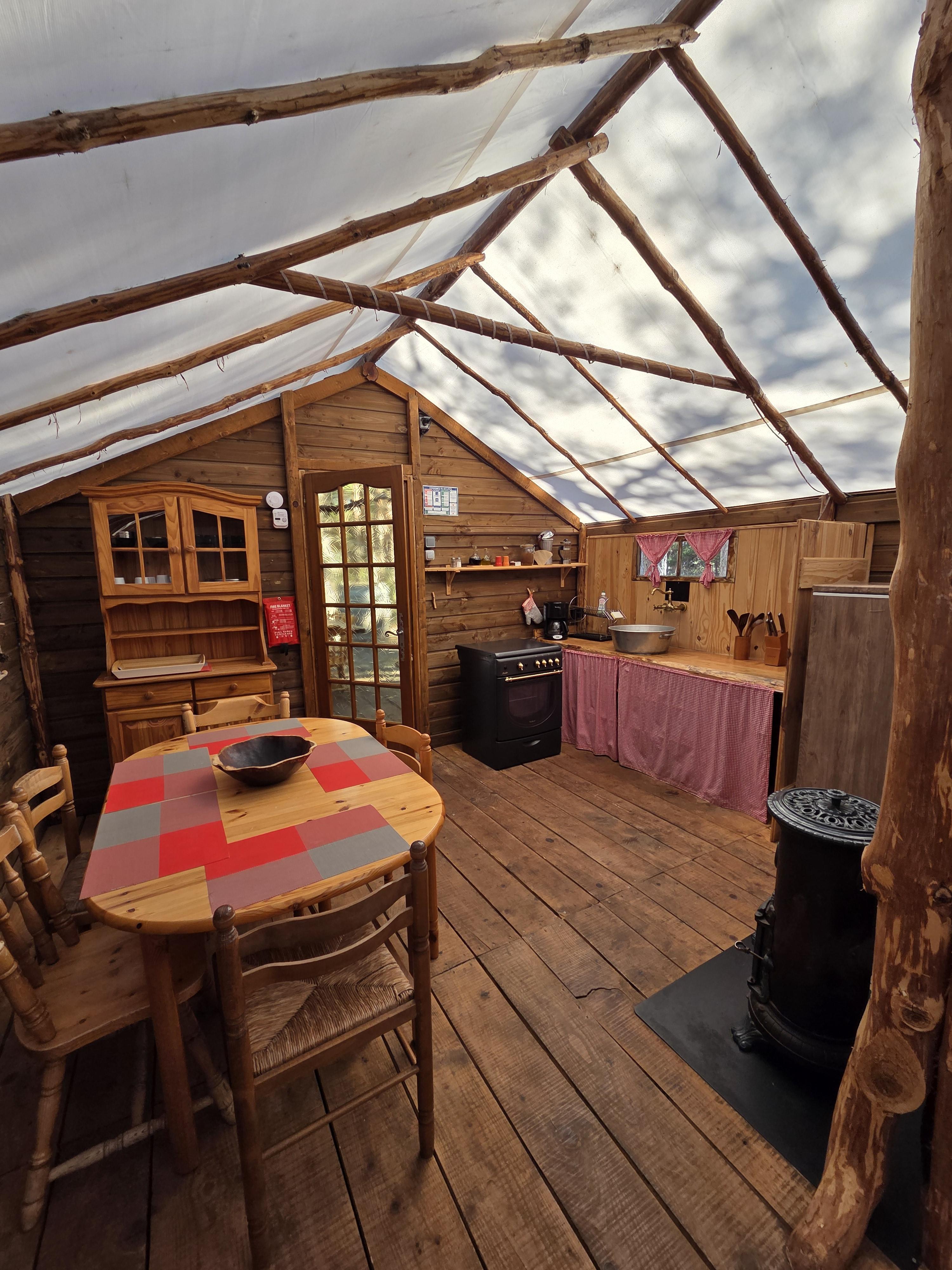 un'area Cabane Trappeur con uno chalet per 2 persone con cucina, uno chalet per 5 persone con la possibilità di montare le tende nelle vicinanze.