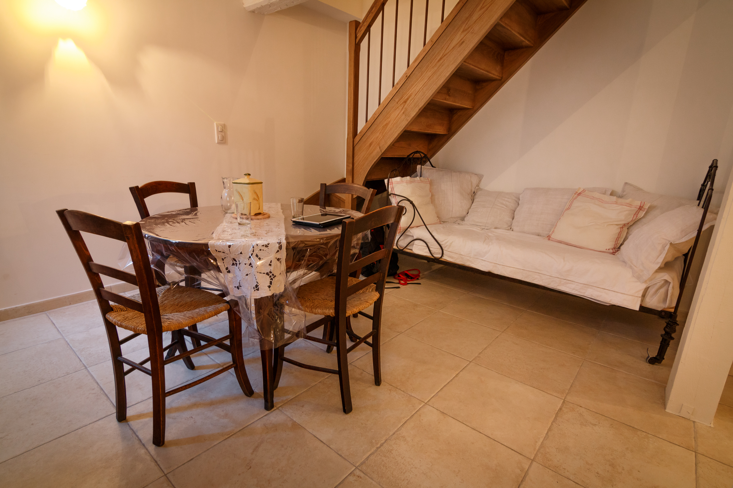 Al piano terra, soggiorno con zona salotto e angolo cottura, WC separato. 1° piano: 1 camera con 1 letto matrimoniale (140 cm), 1 camera con 2 letti a castello (90 cm), 1 letto supplementare (90 cm), bagno con doccia. Terrazza in comune.